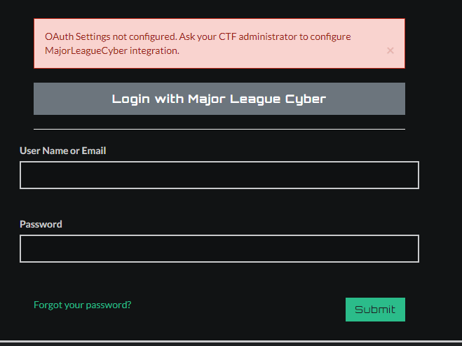 OAuth Settings not configured. Ask your CTF administrator to configure MajorLeagueCyber integration.